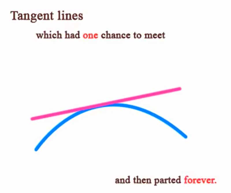 El concepto al que alude esta historia es el de tangencia. Intuitivamente podemos considerar que dos líneas o curvas son tangentes cuando se rozan en un punto. Dicho de otra forma, se puede “pasar el dedo” de una curva a la otra justo en ese punto, el tránsito es suave y sin picos, como un primer beso.